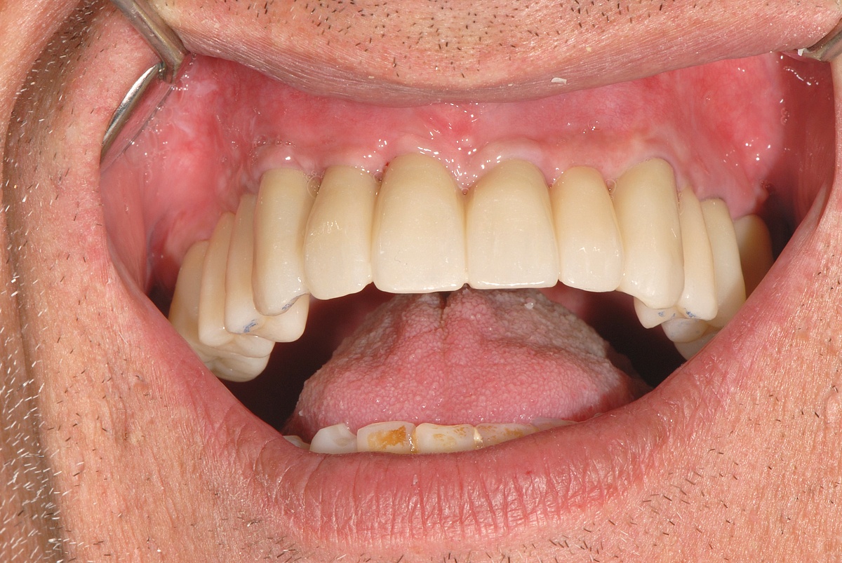 Männlich, 60 Jahre, zahnloser entzündeter, schmerzender Oberkiefer. Therapie: Entfernung aller Zähne im Oberkiefer und Beseitigung Entzündungsgewebe, digital hergestellte und festsitzende Keramikbrücke (8 Implantate)